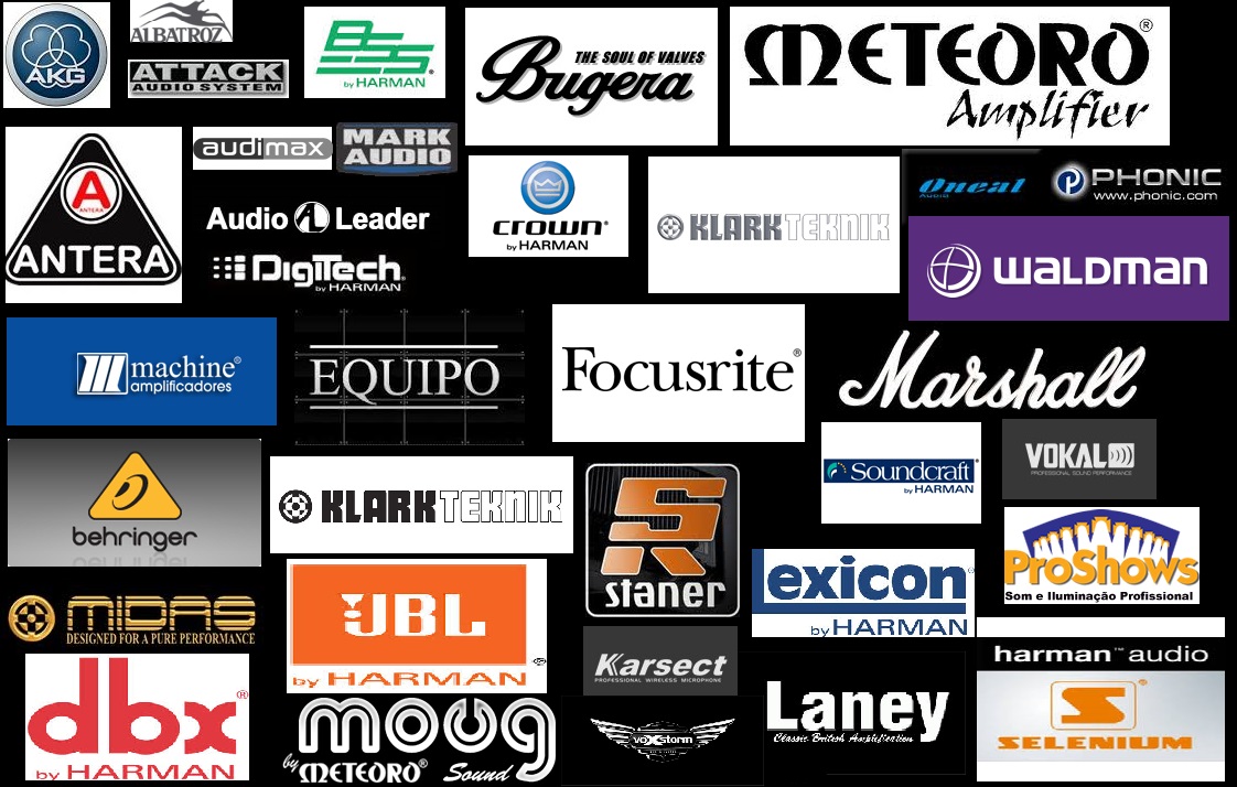 ALTO, AMPEG, ANTERA, AKG, ATTACK, ÁUDIO LEADER, BLACKSTAR, BEHRINGER, BSS, BUGERA, CELESTION, CROWN, DBR, DBX, FENDER, FOCUSRITE, KARSECT, KLARK-TEKNIK, JBL, LEXICON, LEXSEN, LINE 6, M-AUDIO, MACHINE, MARSHALL, MARK ÁUDIO, METEORO, MIDAS, MOOER, MOUG, NOVATION, ONEAL, ROCKTRON, SELENIUM, SOUNDCRAFT, STANER, TURBOSOUND, VOKAL, VOXSTORM, WALDMAN